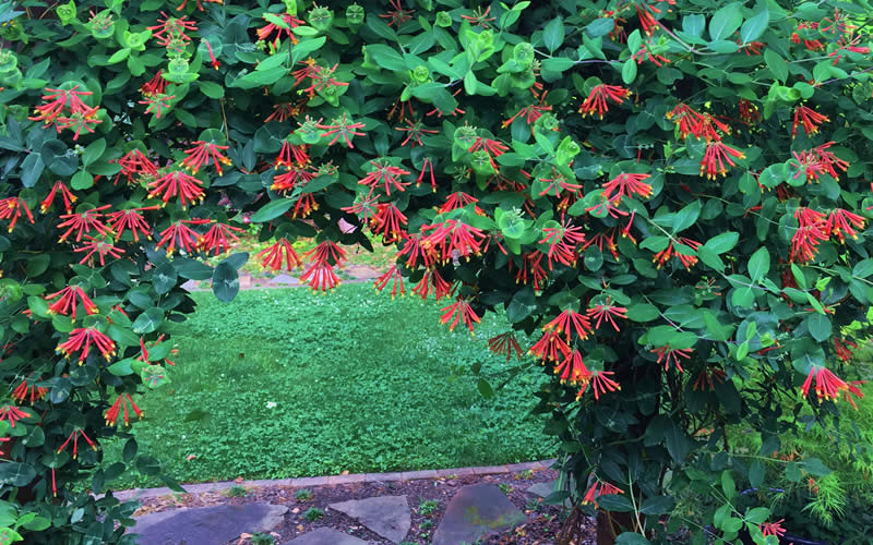 In late winter or very early spring, abundant dangling clusters of radiant-red trumpet-shaped flowers appear and continue all the way through fall and into winter. The flowers were perfectly designed by mother nature for hummingbirds to feed on, and they find them irresistible. Here in our north-central Georgia gardens, Major Wheeler Honeysuckle seems to always be in bloom...at least 10 months out of the year. When there's a mild winter it'll bloom year round, as it did in 2016 in our gardens when there wasn't a day that went by when the vine didn't have blooms on it!