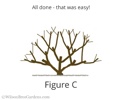Keep in mind that wherever you make a cut on a branch two or more new branches will emerge from just beneath where you made the cut. So, when you're pruning the following year in late winter, you can make your cuts several inches above where you pruned the previous year. This pruning method will double the number of branches every year, which also doubles the number of blooms. After a few years of pruning like this you shouldn't have to prune at all except to remove a stray or broken branch - the plant will keep a nice, dense form all on its own.