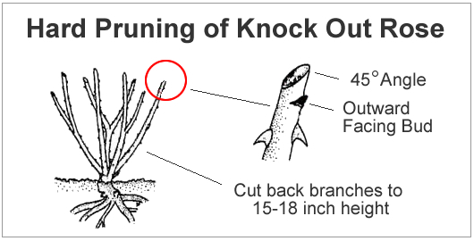 Knock Out Roses can be pruned heavily in late winter or very early spring. This pruning ensures plants will have a good habit and even more healthy blooms throughout the season. This hard pruning can be done while plants are still dormant in later winter or just when you begin to see new leaves begin to emerge. At this time, cut the shrub back to about 12-18" above the ground.