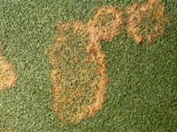 Rust gets its name from the orange, "rusty" appearance it gives leaf blades. Most commonly effecting ryegrasses and Bluegrass, rust tends to flourish in conditions of excessive morning dew, shade, high soil compaction, and low-fertility. The best way to check for rust problems is by taking a white tissue or paper towel and rubbing a few grass blades through it. If an orange color remains, then it's usually rust.Prevention: The best prevention for rust is to aerate your lawn, water well in the morning hours, reduce shade to grass, mow more frequently and bag grass clippings; follow a fertilization schedule to help increase the amount of nitrogen levels in your lawn. If Rust has been a problem in the past, mow frequently and remove clippings from lawn.