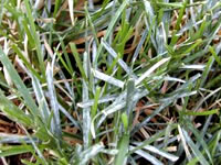 Slime MoldLike powdery mildew, slime molds covers grass with a powdery covering that looks almost like crystallized whitish to greyish frost, sometimes ash-like in appearance It feeds on decaying organic matter found in the soil. As the powdery covering becomes thicker, it reduces the light reaching the plant cells, and they begin to turn yellow.
