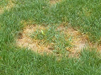 Brown Patch is most common to Bermuda, Bluegrass, Centipede Grass, Bent Grass, St. Augustine, and ryegrasses in regions with high humidity and/or shade. Brown patch commonly starts as a small spot and can quickly spread outwards in a circular or horseshoe pattern up to a couple of feet wide. Often times, while expanding outwards, the inside of the circle will recover, leaving the brown areas resembling a smoke-ring.Prevention: The best prevention for brown patch is to aerate often, reduce shade to effected areas, water only when necessary and in the morning hours, and avoid the use of quick-release, high-nitrogen fertilizers. Nitrogen is the first number in fertilizers. A slow- or time-release fertilizer is okay.