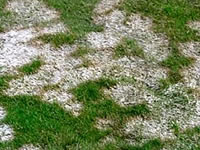 Powdery Mildew - Grass looks as though it is sprinkled with flour. Bluegrass in shady areas are the most susceptible. Grass will wither and die.Prevention: Water only in the morning; reduce shade by pruning, aerate and check drainage in the area.