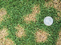 Dollar Spot is most common to Kentucky bluegrass, bent grass, bermuda, and zoysia in hot and humid climates. Dollar spot gets its name from the small, silver dollar-like shape, but can begin as the size of a small grapefruit, and usually look brown or straw-colored in appearance. The spots may merge to form large patches several feet wide. Dollar spot is most common during hot weather with heavy morning dews, and in lawns with low levels of nitrogen.Prevention: The best prevention for Dollar Spot is to aerate often, water in the morning hours, remove excess thatch, and follow a fertilization schedule to help increase the amount of nitrogen levels in your lawn.