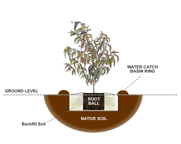 When planting your tree in a site far away from a water source you can use remaining soil mixture to build a water retaining berm (catch basin) around the outside perimeter of the planting hole. This basin will help to collect water from rainfall and irrigation often reducing the need for hand-watering. The berm can be removed after a growing season or two.