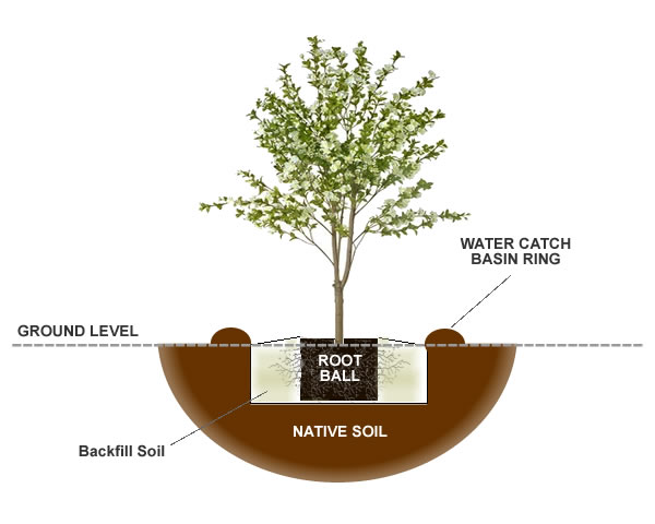 When planting your tree in a site far away from a water source you can use remaining soil mixture to build a water retaining berm (catch basin) around the outside perimeter of the planting hole. This basin will help to collect water from rainfall and irrigation often reducing the need for hand-watering. The berm can be removed after a growing season or two.