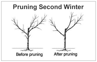 During the first dormant season (winter) after planting, these branches should be pruned back (headed) to a point that leaves 6 or 7 buds on the branch. The height at which branched trees are headed depends on the size of the tree and the positions of good side branches. Remember, you will only be keeping 3 or 4 main scaffold branches. It's best if these are spaced evenly around the trunk. Remove any weak branches growing from the trunk and any suckers growing from the base.
