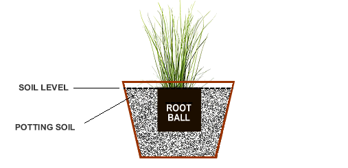 Pour a small amount of your soil mixture in the bottom of the container. Set the plant in the container and make necessary adjustments by adding or removing some soil so that the top edge of the root ball will sit 1/2 to 1" below the rim of the container.