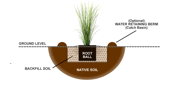 If you are planting your ornamental grass in a location far away from a water source, you can use remaining soil mixture to build a water retaining berm (water catch basin) around the outside perimeter of the planting hole. This basin will help to collect water from rainfall and irrigation often reducing the need for hand-watering. The berm can be removed after a year or so.