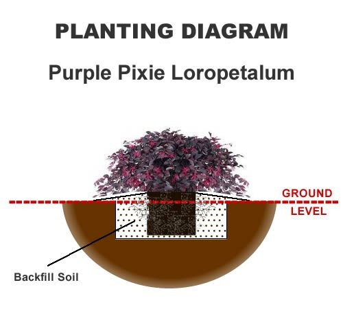 Keep in mind that Purple Pixie Loropetalum must have a well-drained soil. If you are planting in well-drained soil set your plant in the planting hole so that the top edge of the rootball is at or slightly above ground level. If your soil drains slowly, holding water for an extended period of time after rainfall or irrigation, the top of the root ball should be 2 to 3 inches above ground level. If necessary, add some backfill soil mixture to the bottom of the hole to achieve proper planting height.