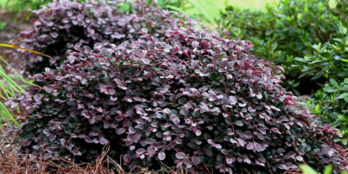 Purple Pixie® Loropetalum requires little if any pruning to keep its dense and mounding form. A stray or damaged branch that is spoiling the shape or the look of the plant can be snipped off any time of year. Plants can be sheared a couple times during the active growth season for a more formal appearance.